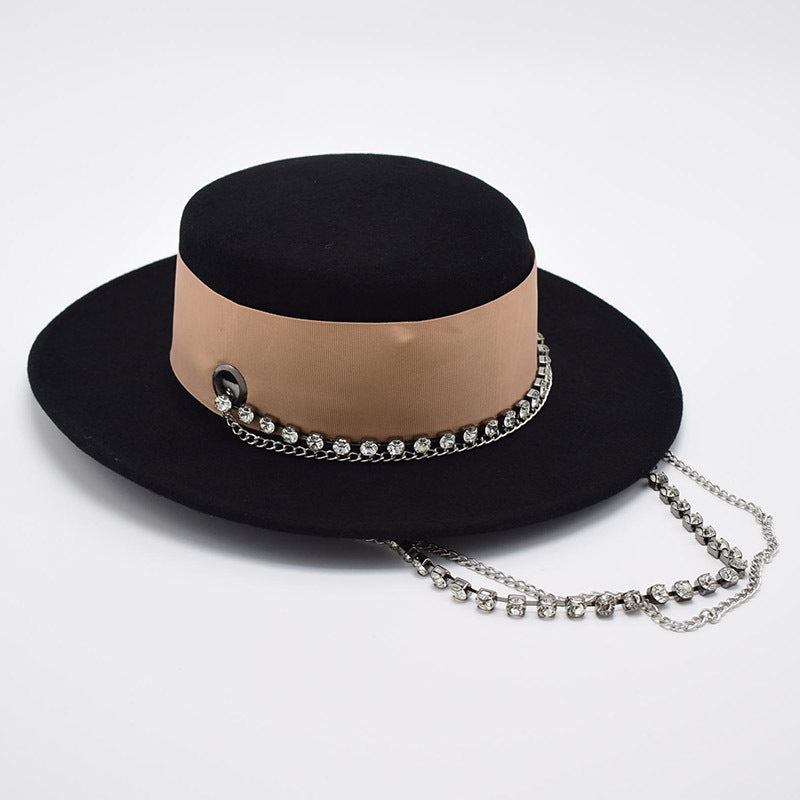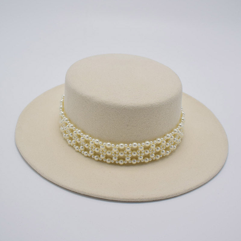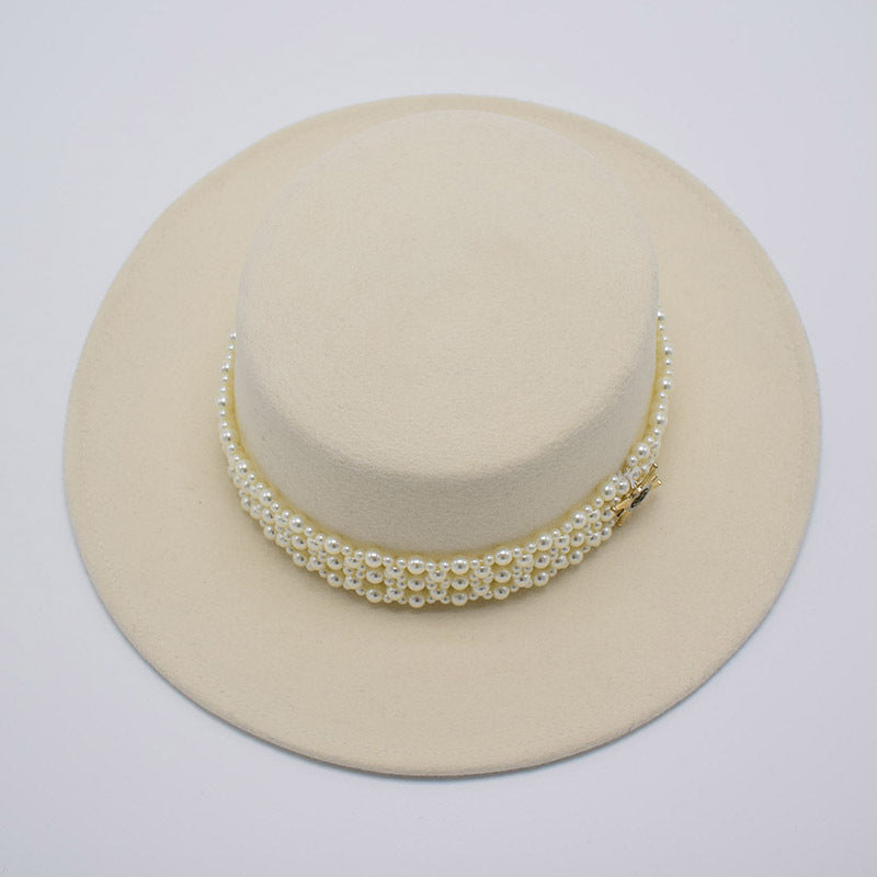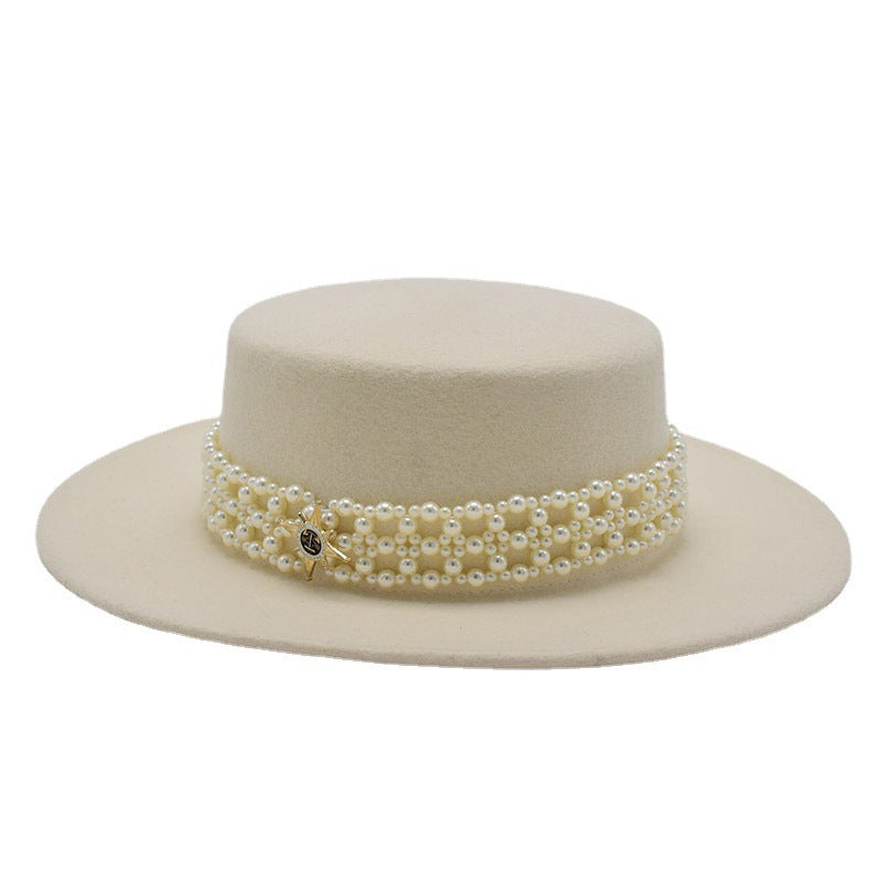 Wide Brim Flat Top Woolen Hat Women's Pearl Chain Felt Cap