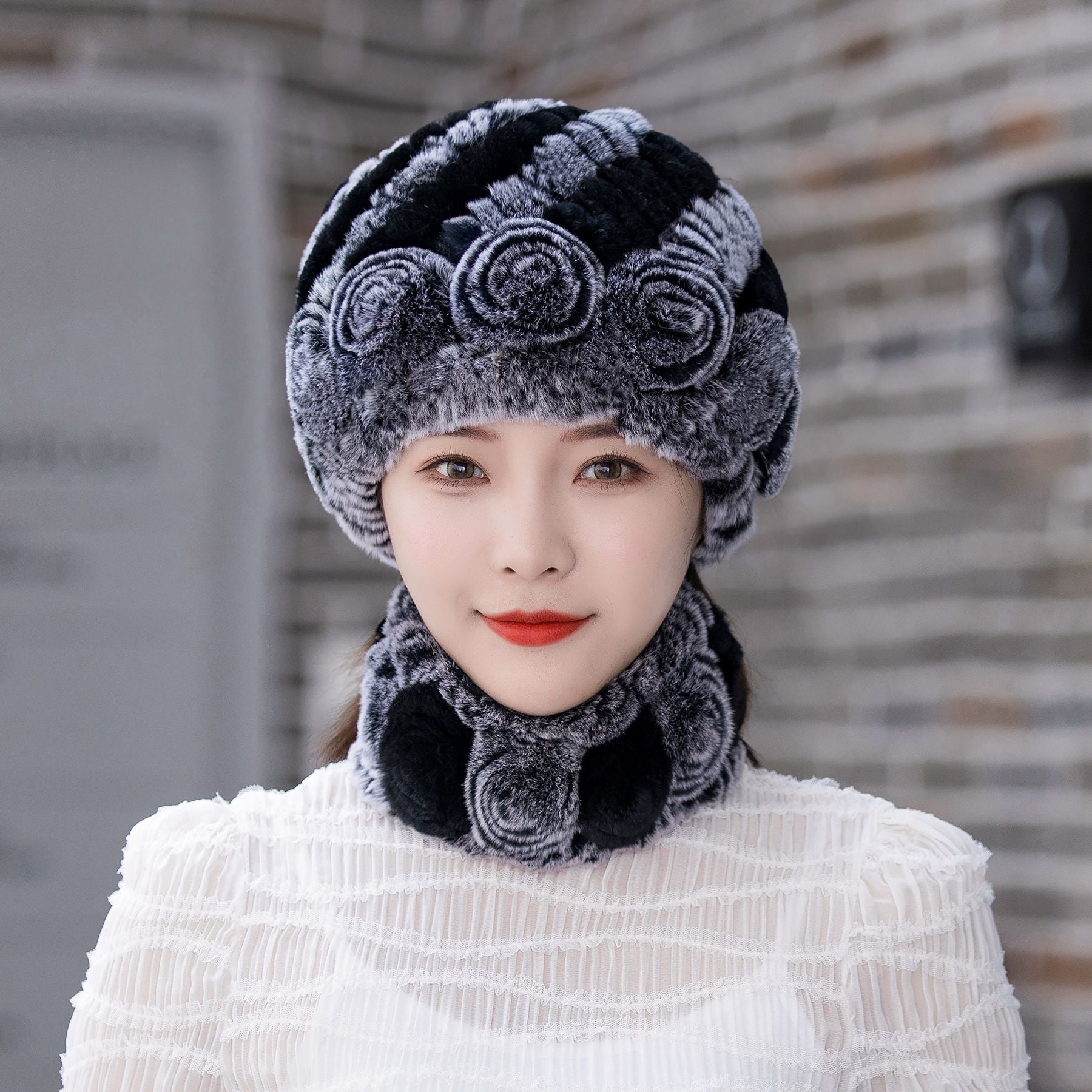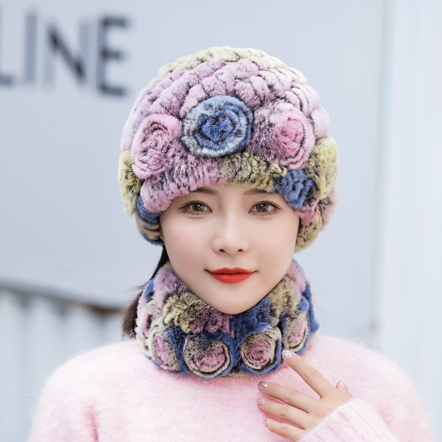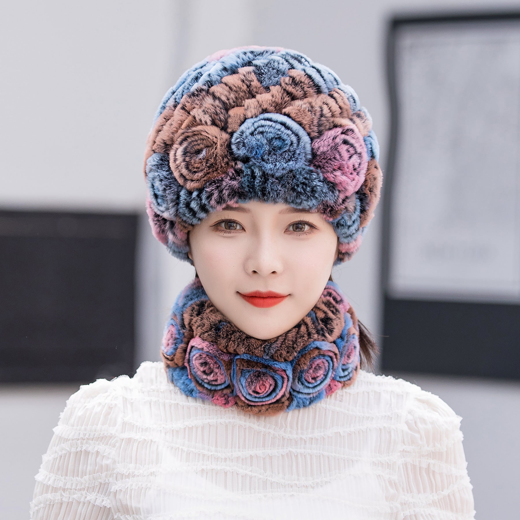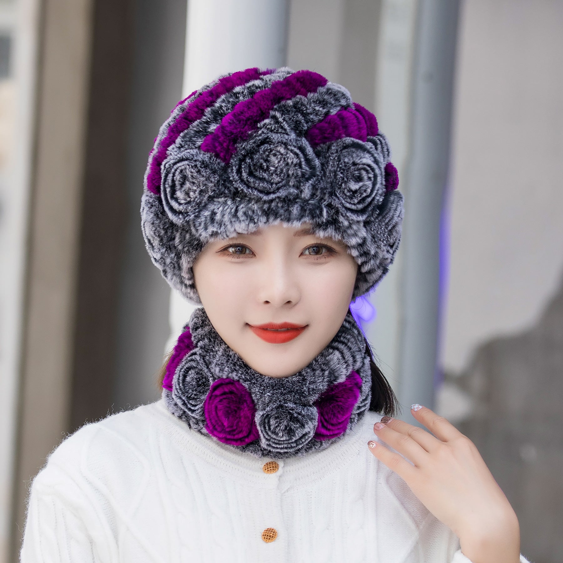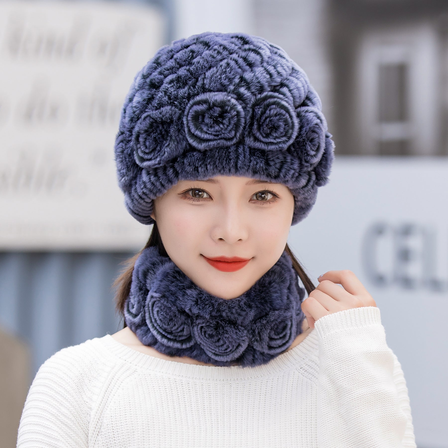 Winter Warm Rex Rabbit Fur Hat Scarf Suit