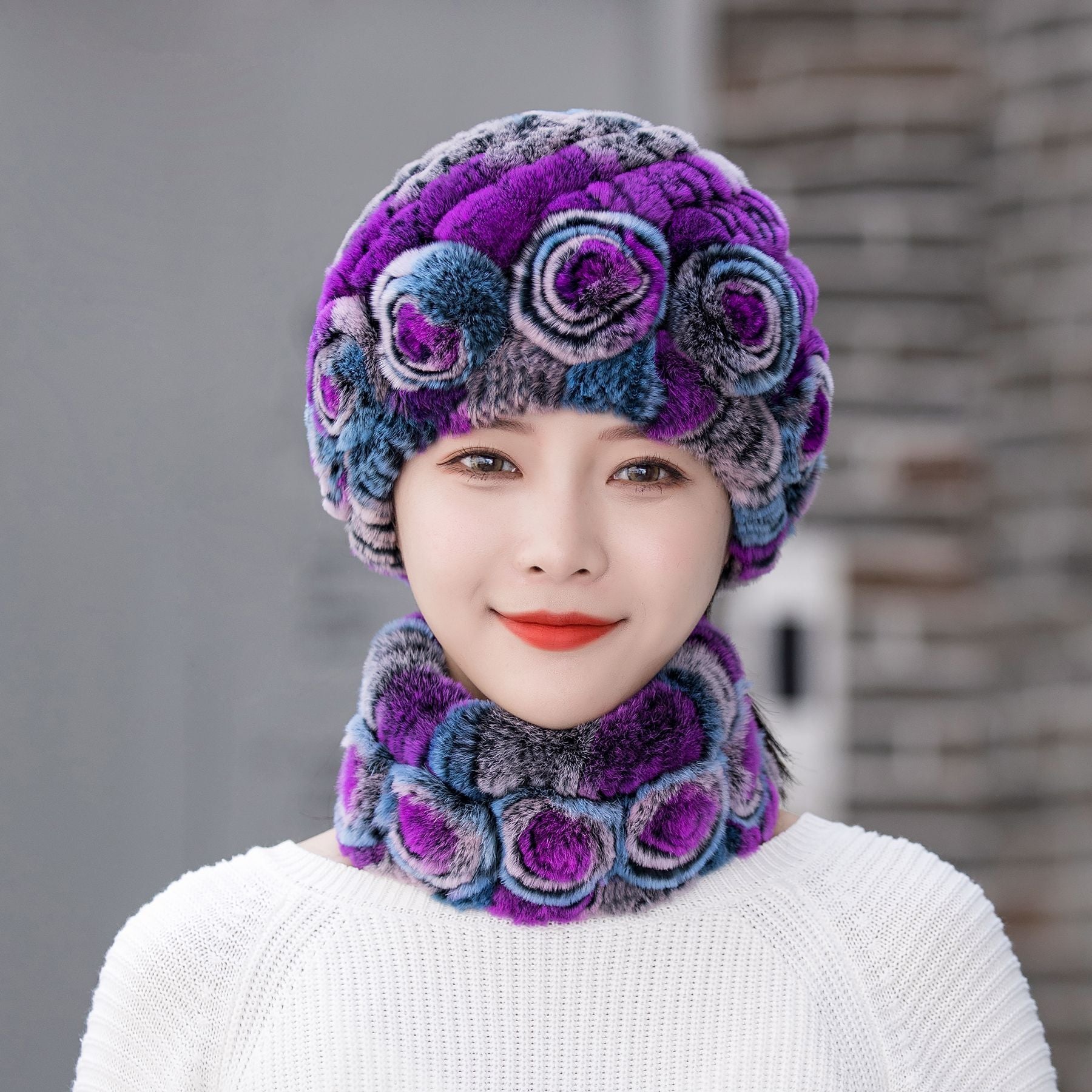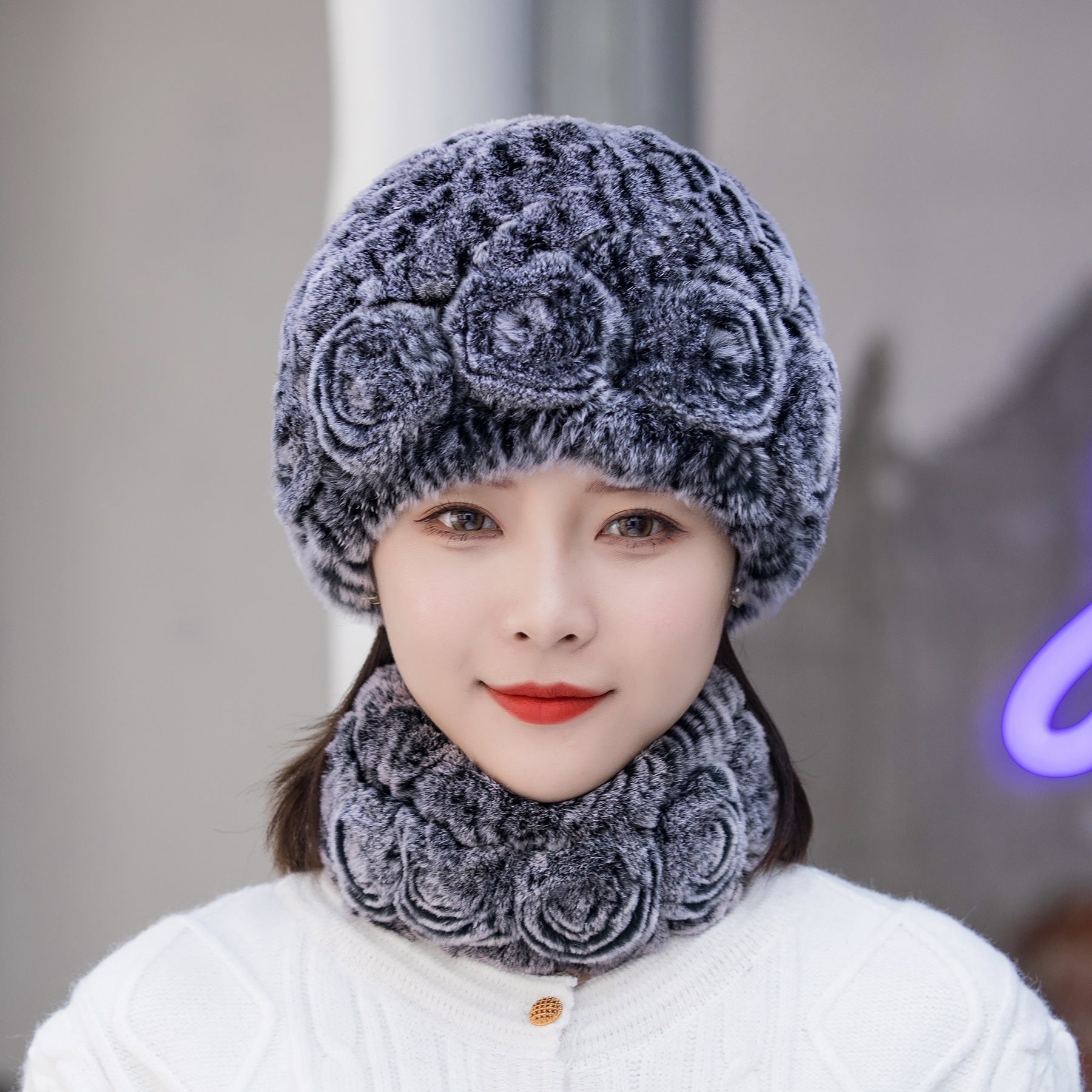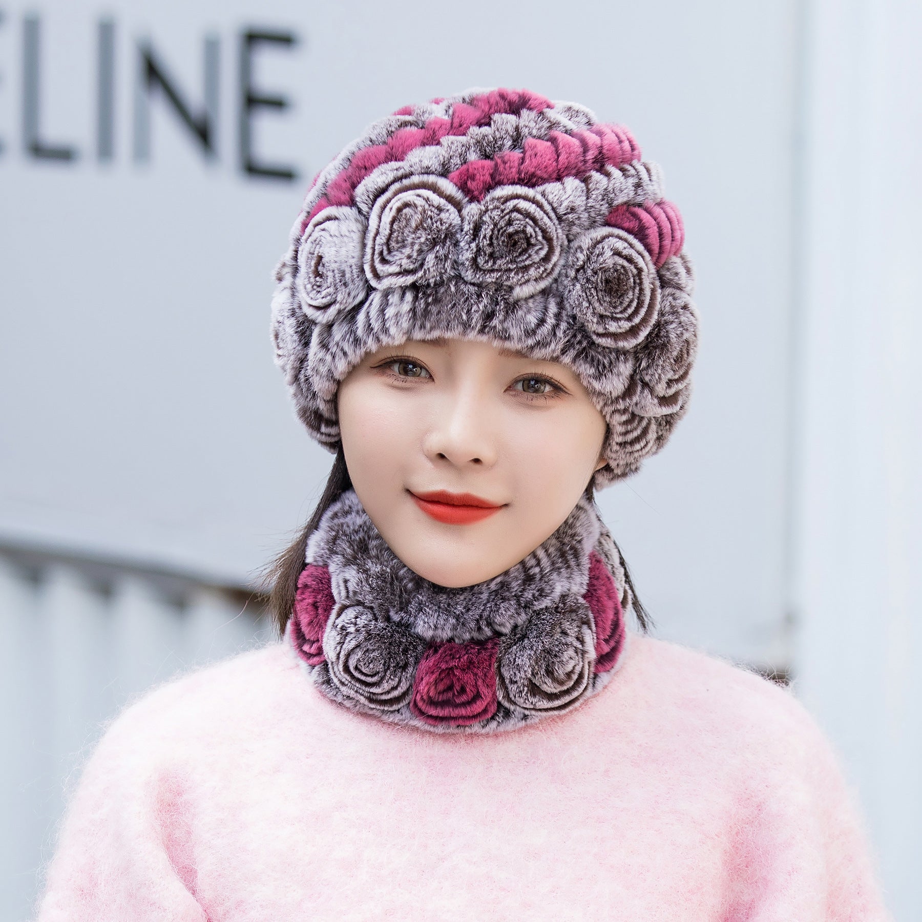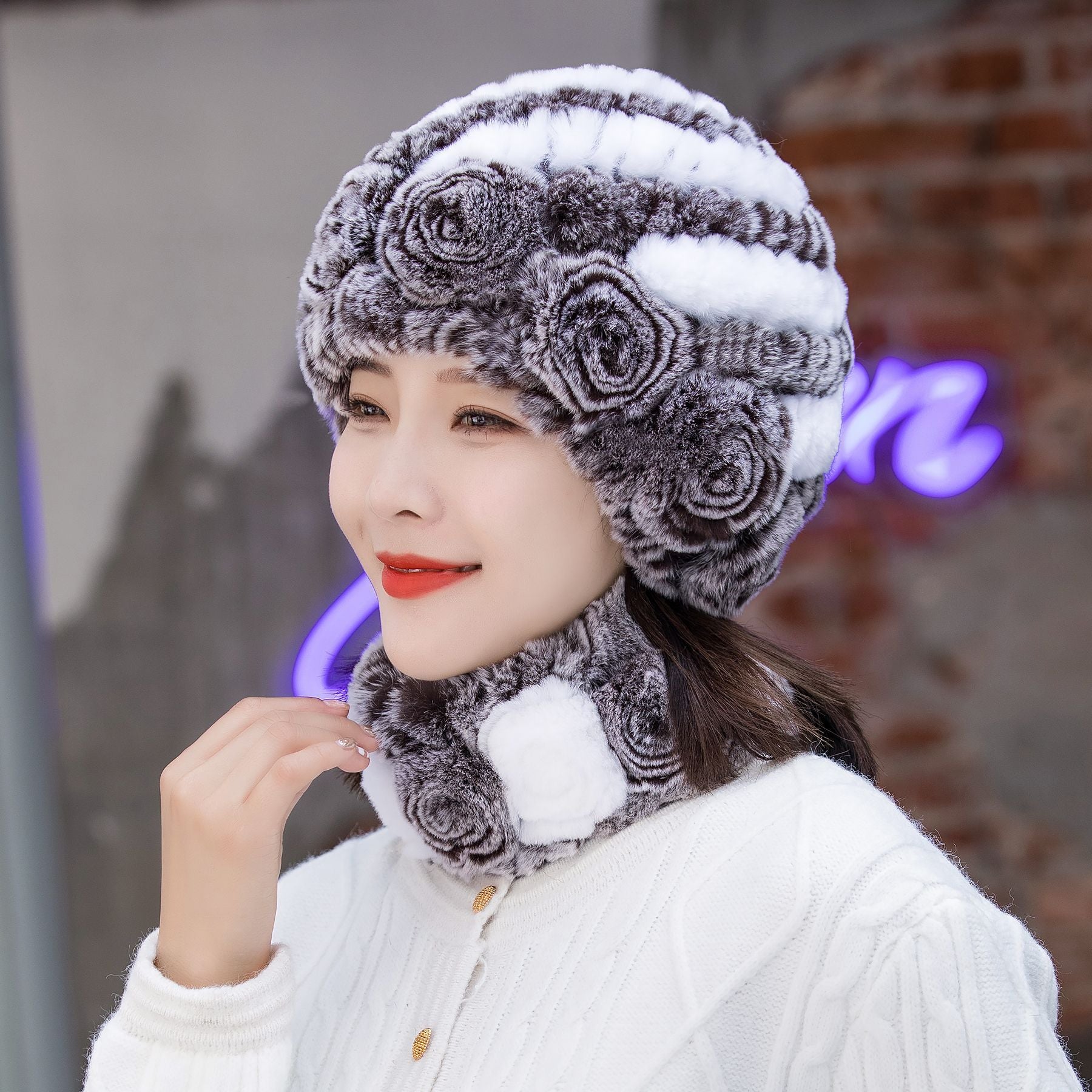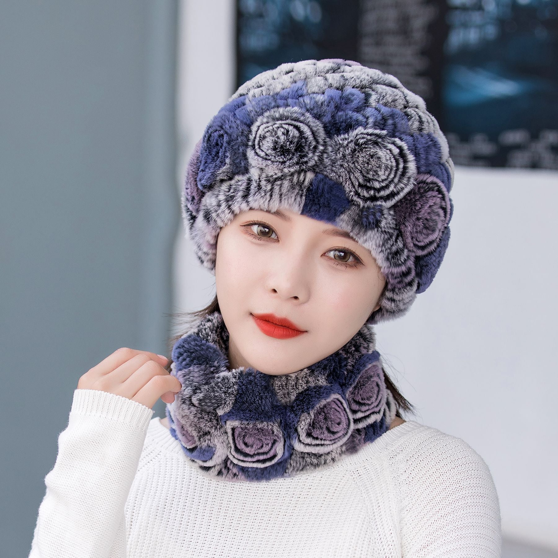 Winter Warm Rex Rabbit Fur Hat Scarf Suit