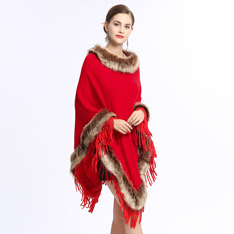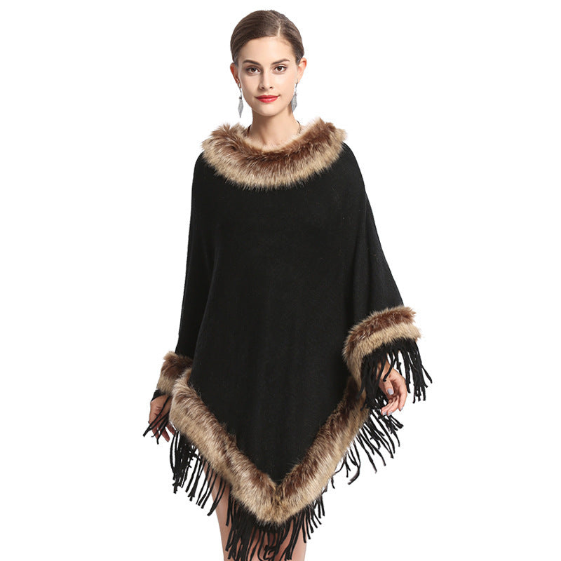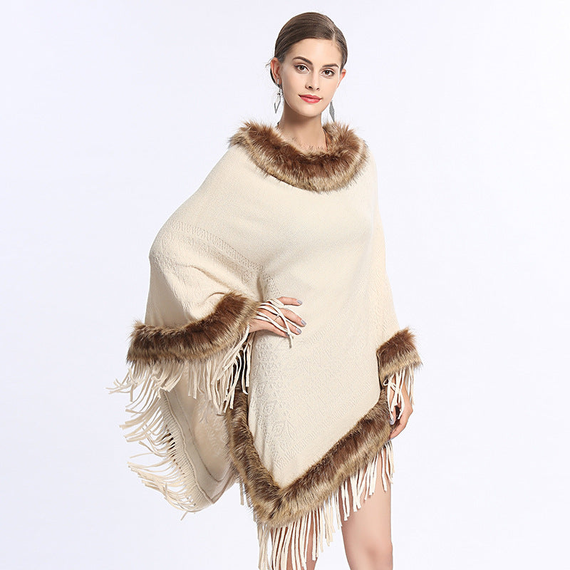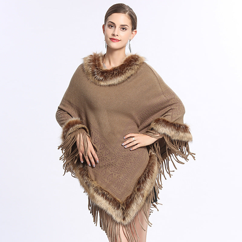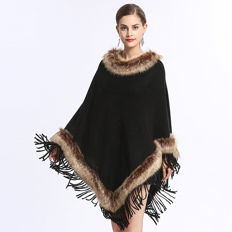 Faux Fox Fur Collar Tassel Pullover Knitting Cape And Shawl Coat
